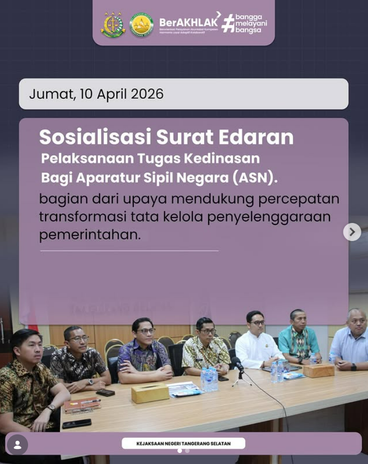 Dalam rangka mendukung percepatan transformasi tata kelola penyelenggaraan pemerintahan, Kejaksaan Republik Indonesia melaksanakan kegiatan Sosialisasi Surat Edaran tentang Pelaksanaan Tugas Kedinasan bagi Aparatur Sipil Negara