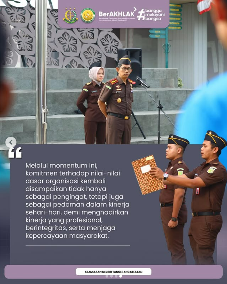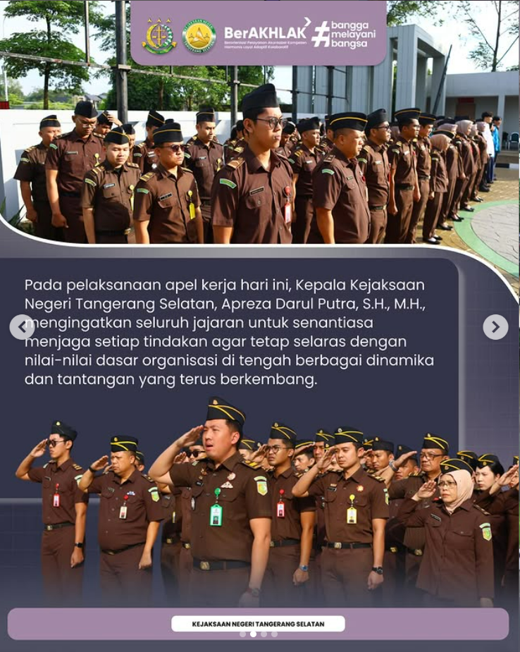 Kepala Kejaksaan Negeri Tangerang Selatan, Bapak Apreza Darul Putra,S.H., M.H., memimpin apel pagi dan menyampaikan arahan mengenai peningkatan kinerja di seluruh bidang.