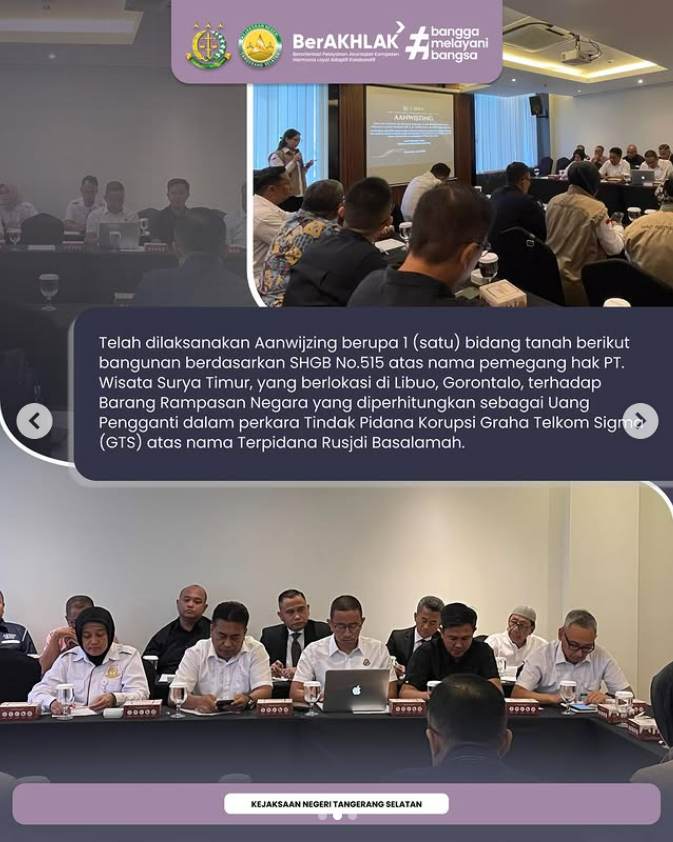 Telah dilaksanakan Aanwijzing berupa 1 (satu) Bidang Tanah Berikut Bangunan berdasarkan SHGB No.515 atas nama pemegang hak PT. Wisata Surya Timur, yang berlokasi di Libuo, Gorontalo, terhadap Barang Rampasan Negara yang diperhitungkan sebagai Uang Pengganti dalam perkara Tindak Pidana Korupsi Graha Telkom Sigma (GTS) atas nama Terpidana Rusjdi Basalamah.