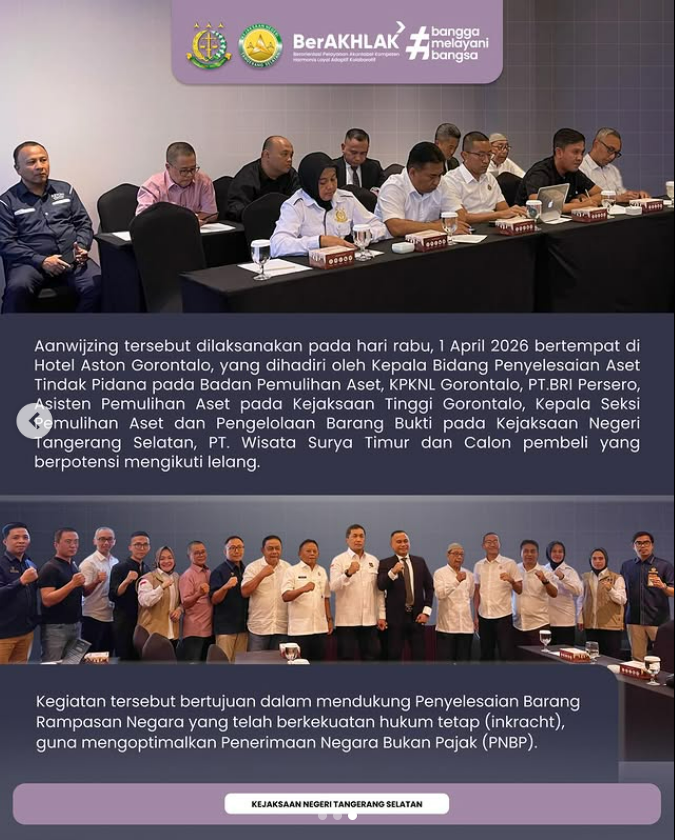 Aanwijzing tersebut dilaksanakan pada hari Rabu, 1 April 2026 bertempat di Hotel Aston Gorontalo, yang dihadiri oleh Kepala Bidang Penyelesaian Aset Tindak Pidana pada Badan Pemulihan Aset, KPKNL Gorontalo, PT.BRI Persero, Asisten Pemulihan Aset pada Kejaksaan Tinggi Gorontalo, Kepala Seksi Pemulihan Aset dan Pengelolaan Barang Bukti pada Kejaksaan Negeri Tangerang Selatan, PT. Wisata Surya Timur dan Calon Pembeli yang berpotensi mengikuti lelang.