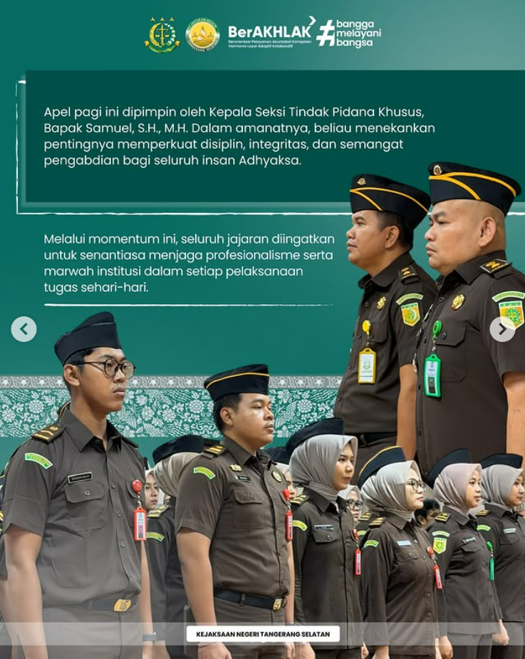 Kejaksaan Negeri Tangerang Selatan melaksanakan Apel Kerja sebagai wujud komitmen dalam menjaga integritas dan profesionalisme dalam setiap pelaksanaan tugas dan tanggung jawab sebagai aparatur penegak hukum.