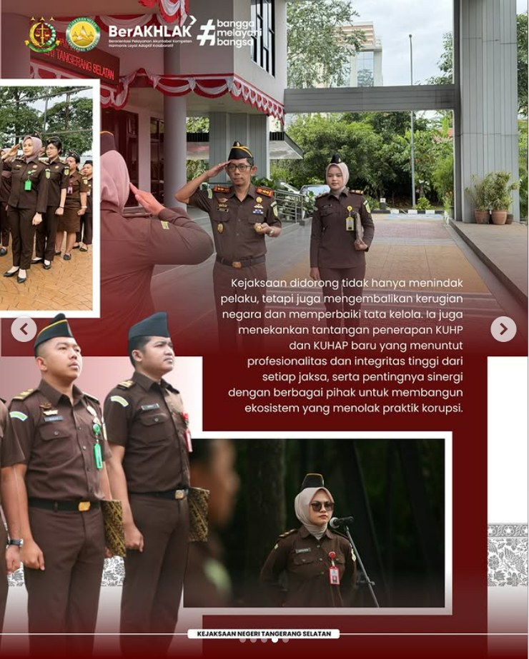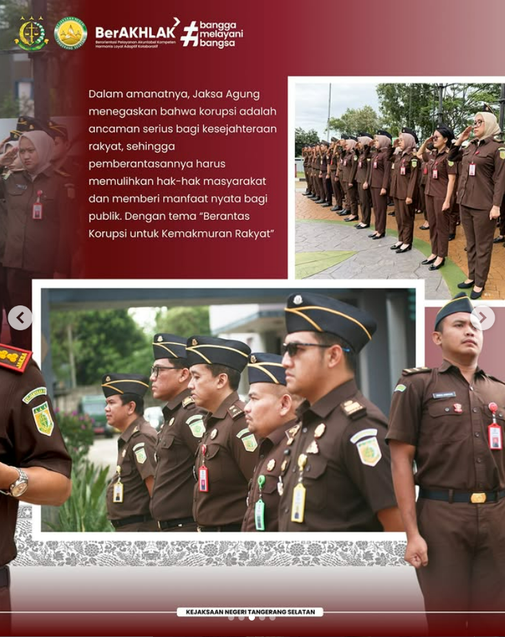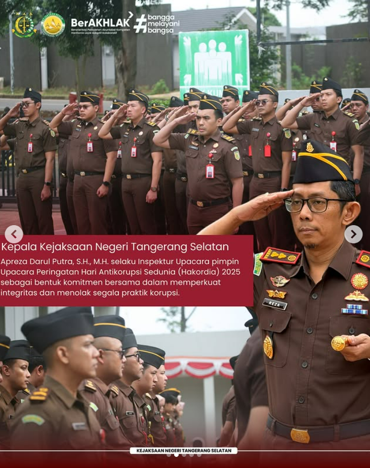 Kepala Kejaksaan Negeri Tangerang Selatan Apreza Darul Putra, S.H., M.H. selaku Inspektur Upacara pimpin Upacara Peringatan Hari Antikorupsi Sedunia (Hakordia) 2025 sebagai bentuk komitmen bersama dalam memperkuat integritas dan menolak segala praktik korupsi.
