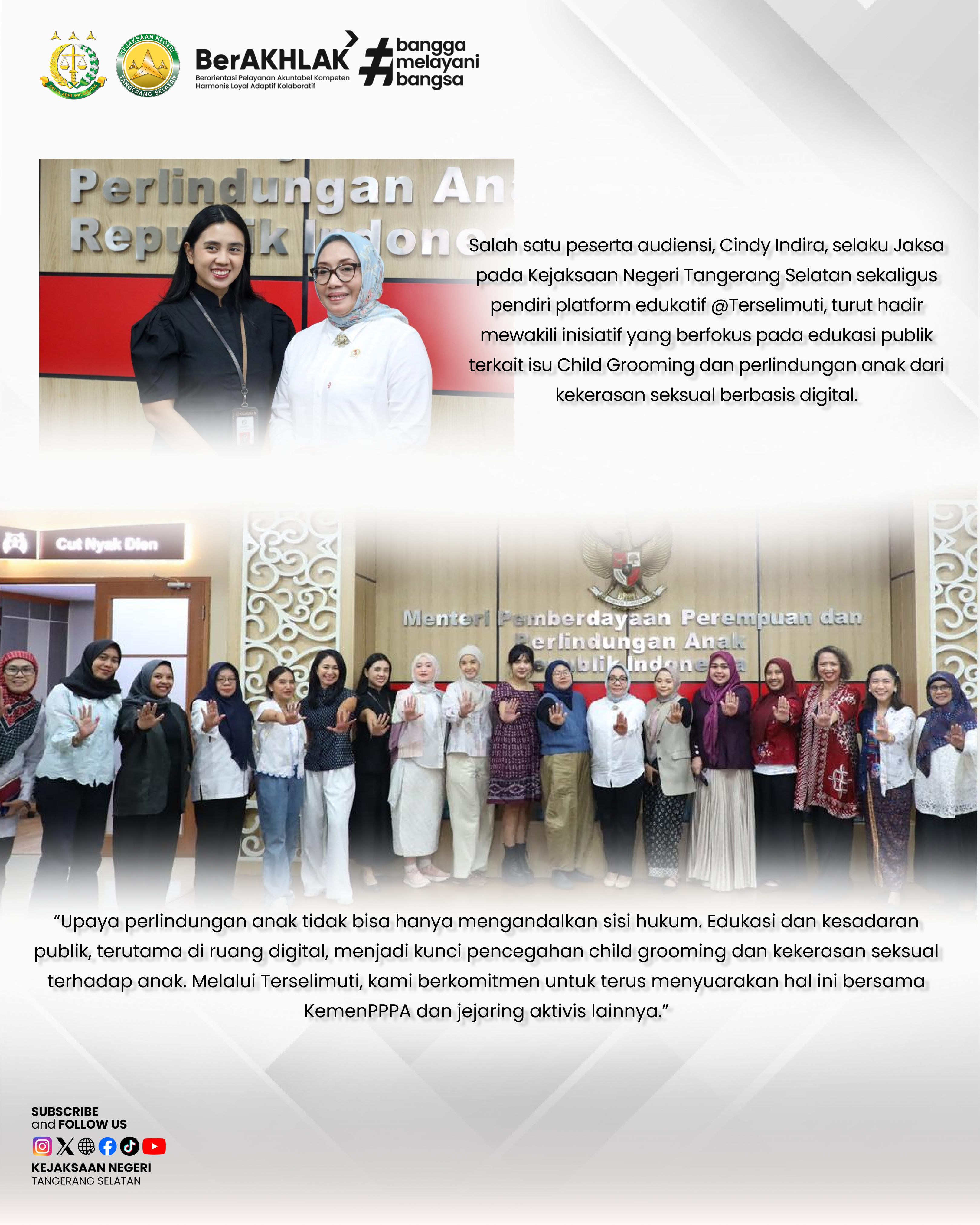Salah satu peserta audiensi, Cindy Indira, selaku Jaksa pada Kejaksaan Negeri Tangerang Selatan sekaligus pendiri platform edukatif @Terselimuti, turut hadir mewakili inisiatif yang berfokus pada edukasi publik terkait isu Child Grooming dan perlindungan anak dari kekerasan seksual berbasis digital.