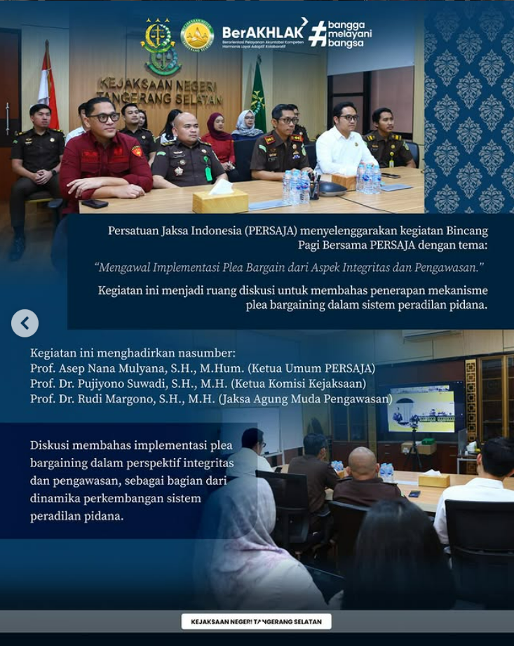 Persatuan Jaksa Indonesia (PERSAJA) menyelenggarakan kegiatan Bincang Pagi Bersama PERSAJA dengan tema “Mengawal Implementasi Plea Bargaining dari Aspek Integritas dan Pengawasan”.
