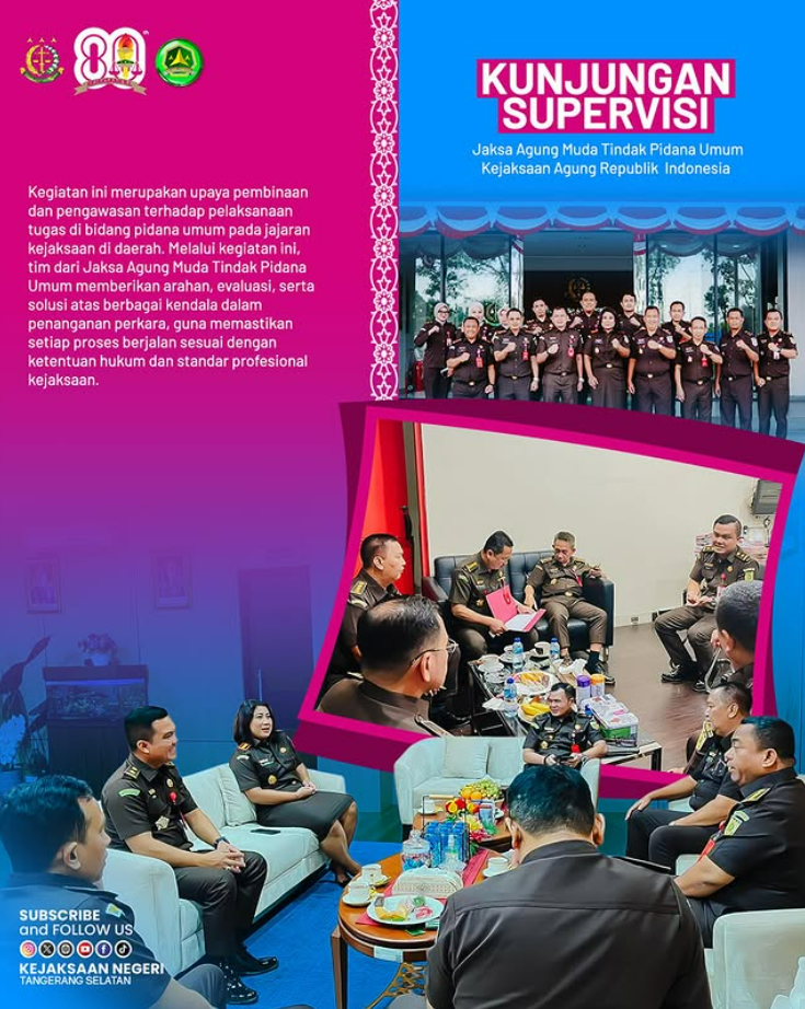 Kepala Kejaksaan Negeri Tangerang Selatan, Apsari Dewi, S.H., M.H., LL.M., Ph.D. menerima kunjungan Supervisi dari Tim Jaksa Agung Muda Tindak Pidana Umum Kejaksaan Agung Republik Indonesia pada Senin (13/10/2025). Kegiatan ini merupakan upaya pembinaan dan pengawasan terhadap pelaksanaan tugas di bidang pidana umum pada jajaran kejaksaan di daerah. Melalui kegiatan ini, tim dari Jaksa Agung […]