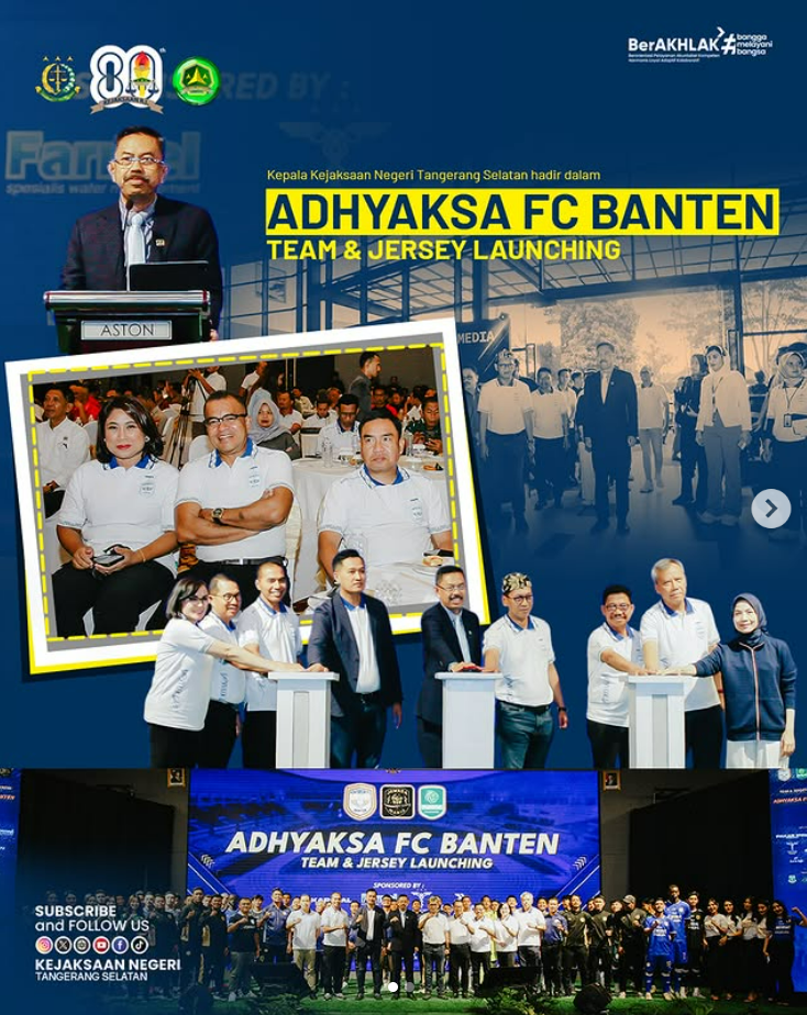 Kepala Kejaksaan Negeri Tangerang Selatan, Ibu Apsari Dewi., S.H., LL.M., Ph.D. Menghadiri Launching Team dan Jersey Adhyaksa FC Banten pada Selasa 09 September 2025 yang dilaksanakan di Ballroom Hotel Aston Serang yang dipimpin langsung oleh Kepala Kejaksaan Tinggi Banten, Dr. Siswanto, S.H., M.H.,. Perjalanan Adhyaksa FC dimulai dari level terbawah. Klub ini sukses menjuarai Liga […]