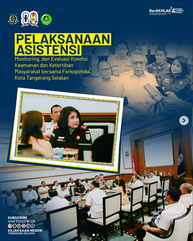 Kepala Kejaksaan Negeri Tangerang Selatan, Ibu Apsari Dewi., S.H., LL.M., Ph.D. Menghadiri Pelaksanaan Asistensi, Monitoring, dan Evaluasi Kondisi Keamanan dan Ketertiban Masyarakat bersama Forkopimda Kota Tangerang Selatan. Kegiatan ini bertujuan untuk memperoleh gambaran yang jelas mengenai situasi aktual di lapangan. Melalui kegiatan ini, Kejaksaan Negeri Tangerang Selatan berupaya untuk mengidentifikasi potensi kerawanan dan hambatan yang […]
