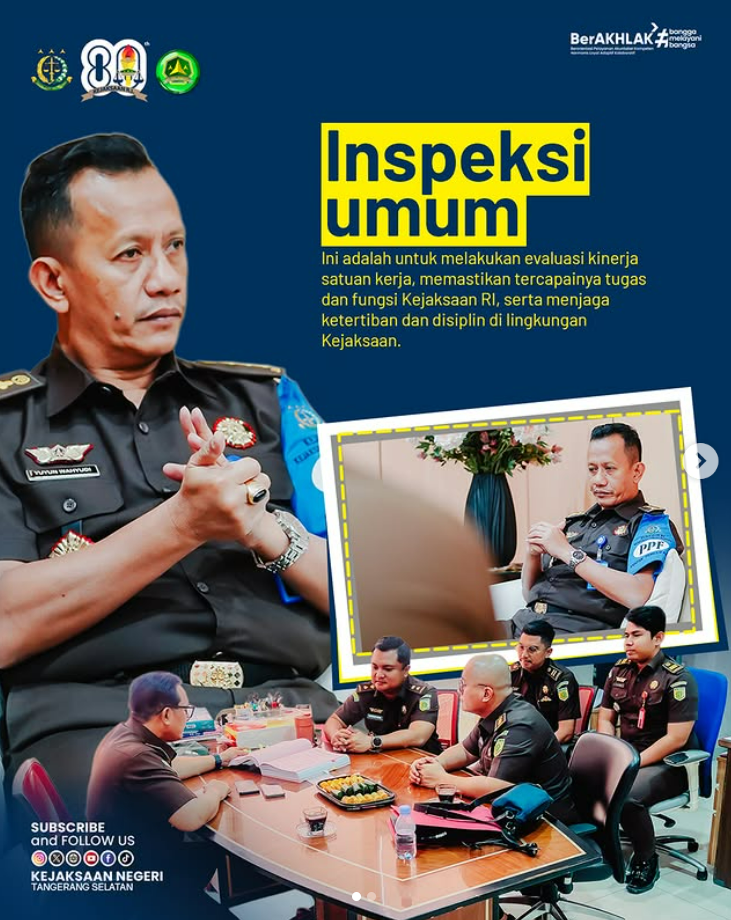 Pada hari Senin (15/09/2025), Plh. Kepala Kejaksaan Negeri Tangerang Selatan, Sigit Suharyanto, S.E., S.H., M.H., menerima kunjungan Asisten Pengawasan (Aswas), Yuyun Wahyudi, S.H., M.H. dan tim Pemeriksa Kejaksaan Tinggi Banten, kehadiran Aswas ini difokuskan pada evaluasi kinerja dan pemantauan hasil inspeksi. Tujuan pemantauan inspeksi umum ini adalah untuk melakukan evaluasi kinerja satuan kerja, memastikan tercapainya […]
