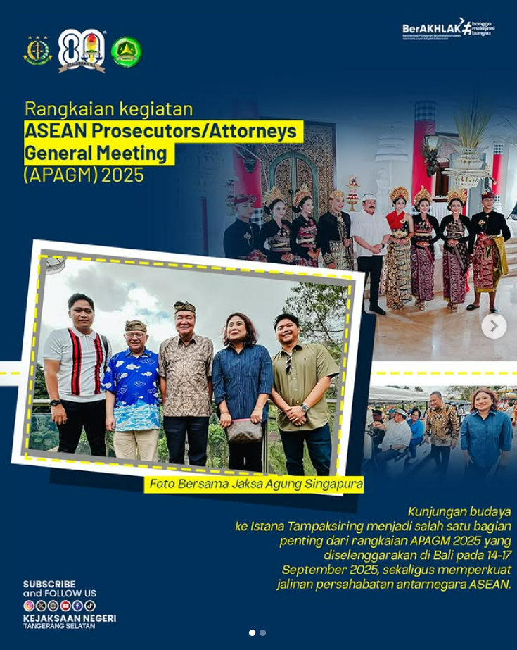 Kepala Kejaksaan Negeri Tangerang Selatan, Apsari Dewi, S.H., LL.M., Ph.D., turut serta dalam kelanjutan rangkaian ASEAN Prosecutors/Attorneys General Meeting (APAGM) 2025 melalui Cultural Visit ke Istana Kepresidenan Tampaksiring, Bali, pada Selasa, 16 September 2025. Kegiatan ini dihadiri oleh Jaksa Agung Republik Indonesia ST Burhanuddin, Para Jaksa Agung negara anggota ASEAN ataupun perwakilan serta jajaran Kejaksaan […]