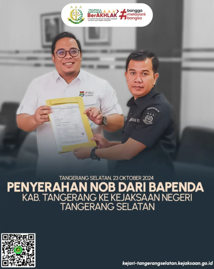 Kepala Sub Bagian Pembinaan Pada Kejaksaan Negeri Tangerang Selatan Iskandar Zulkarnaen, S.H., M.H. Telah melakukan Penyerahan NOB dari Bapenda Kabupaten Tangerang kepada Kejaksaan Negeri Tangerang Selatan sebagai persyaratan pengurusan sertifikat BMN PSP rumah Rampasan Negara cluster The Avani.
