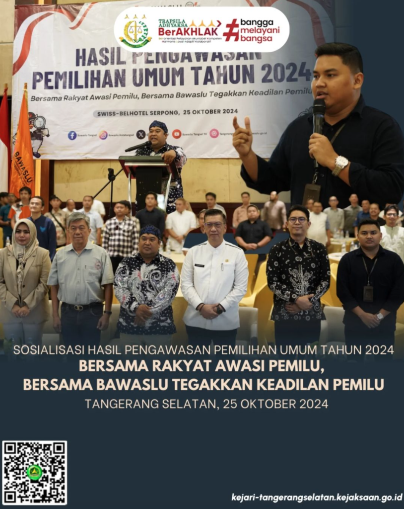 Kejaksaan Negeri Tangerang Selatan diwakili oleh Jaksa Fungsional pada Bidang Intelijen Aziz Ma’ruf., S.,H., M. H. hadir sebagai Narasumber dalam acara Sosialisasi Hasil Pengawasan Pemilihan Umum Tahun 2024 dengan Tema “Bersama Rakyat Awasi Pemilu, Bersama Bawaslu Tegakkan Keadilan Pemilu” , yang diselenggarakan oleh Badan Pengawas Pemilu Kota Tangerang Selatan.Jumat ( 25 Oktober 2024)