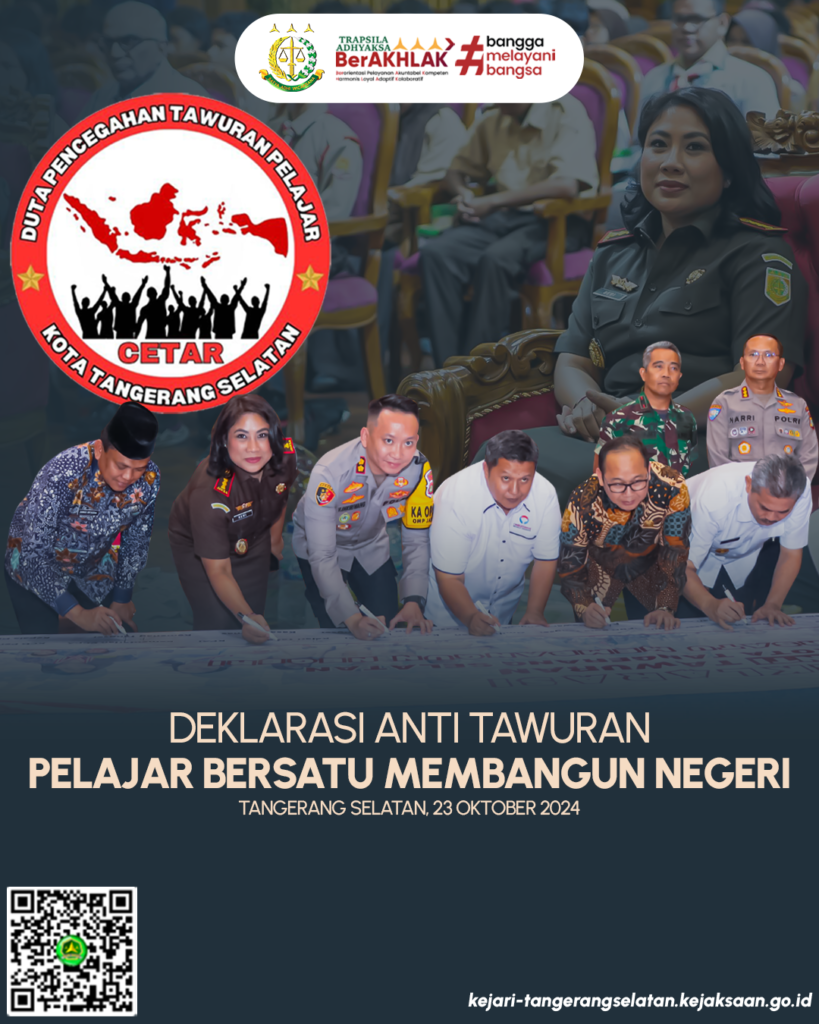 Komitmen Bersama Lindungi Masa Depan Generasi Muda 💥 Kepala Kejaksaan Negeri Tangerang Selatan Apsari Dewi S.H., LL, M., Ph.D. hadir dalam acara “Deklarasi Anti Tawuran Pelajar Kota Tangerang Selatan” yang diadakan oleh Kepolisian Resor Tangerang Selatan bekerjasama dengan Dinas Pendidikan dan Kebudayaan Kota Tangerang Selatan, Rabu (23/10/2024). Acara yang digelar di Global Islamic School Kota […]