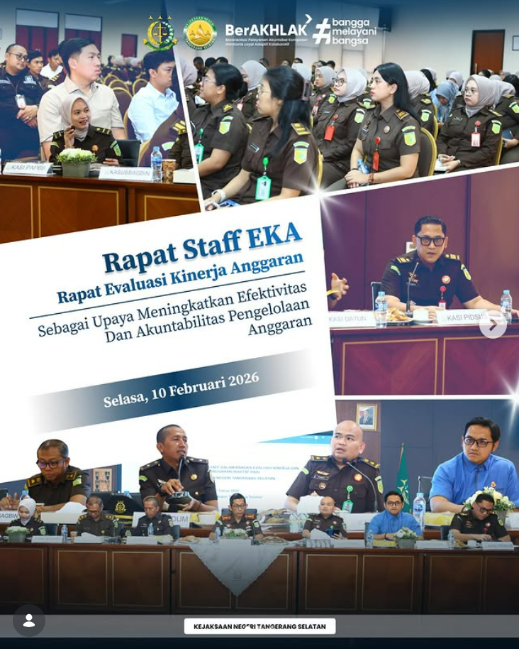 Kejaksaan Negeri Tangerang Selatan melaksanakan Rapat Evaluasi Kinerja Anggaran (EKA) sebagai upaya meningkatkan efektivitas dan akuntabilitas pengelolaan anggaran. Rapat ini membahas capaian realisasi anggaran pada setiap bidang/seksi, sekaligus mengidentifikasi hambatan pelaksanaan kegiatan serta merumuskan langkah strategis percepatan penyerapan anggaran sesuai ketentuan yang berlaku. Kepala Kejaksaan Negeri Tangerang Selatan, Apreza Darul Putra, S.H., M.H., menekankan pentingnya […]
