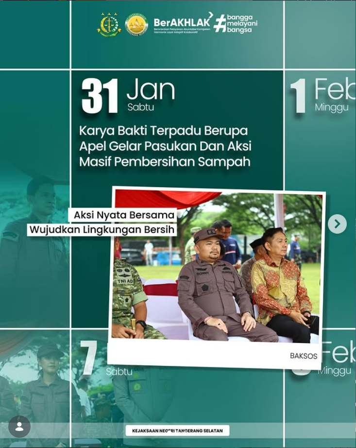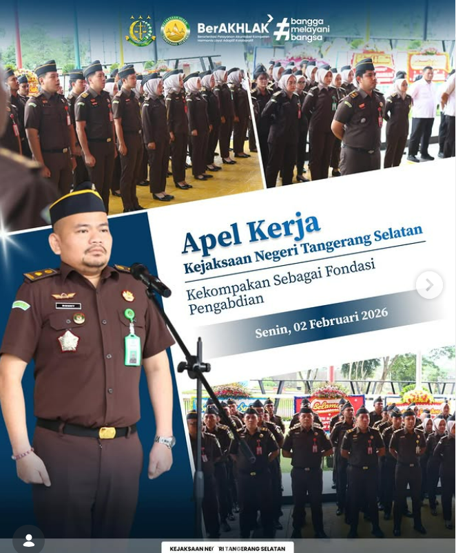 Mengawali pekan baru dengan semangat, seluruh Pegawai dan PPNPN Kejaksaan Negeri Tangerang Selatan mengikuti Apel Pagi yang berlangsung dengan tertib. Apel pagi dipimpin oleh Kepala Seksi Intelijen Ronny Bona Tua Hutagalung, S.H., M.H., apel kerja dilaksanakan sebagai sarana penguatan soliditas, disiplin, dan kebersamaan seluruh jajaran Kejaksaan Negeri Tangerang Selatan dalam mendukung pelaksanaan tugas dan fungsi […]