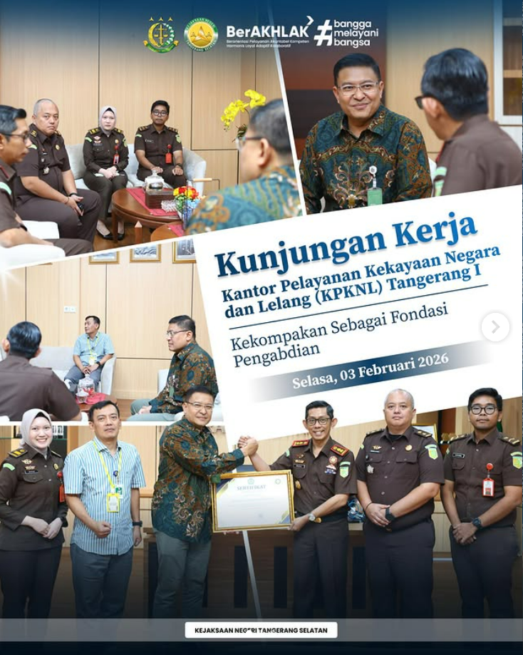 Kepala Kejaksaan Negeri Tangerang Selatan, Apreza Darul Putra, S.H., M.H., menerima kunjungan kerja Kepala Kantor Pelayanan Kekayaan Negara dan Lelang (KPKNL) Tangerang I, Sunu Subroto, dalam rangka memperkuat sinergi dan koordinasi antar-instansi, khususnya terkait pengelolaan kekayaan negara dan pelaksanaan lelang. Dalam kesempatan tersebut, Kepala KPKNL I Tangerang sekaligus menyerahkan piagam penghargaan kepada Kejaksaan Negeri Tangerang […]
