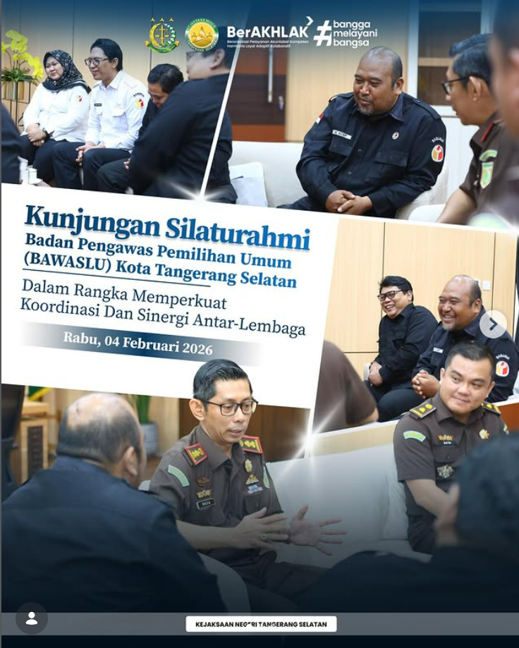 Kepala Kejaksaan Negeri Tangerang Selatan, Apreza Darul Putra, S.H., M.H. menerima kunjungan dari Ketua Badan Pengawas Pemilihan Umum (Bawaslu) Tangerang Selatan, Muhamad Acep beserta jajaran. Kunjungan ini menjadi momentum silaturahmi sekaligus diskusi dalam rangka memperkuat koordinasi dan sinergi antar-lembaga, khususnya terkait pengawasan dan penegakan hukum pada tahapan penyelenggaraan pemilu. Melalui kegiatan ini, diharapkan terjalin komunikasi […]