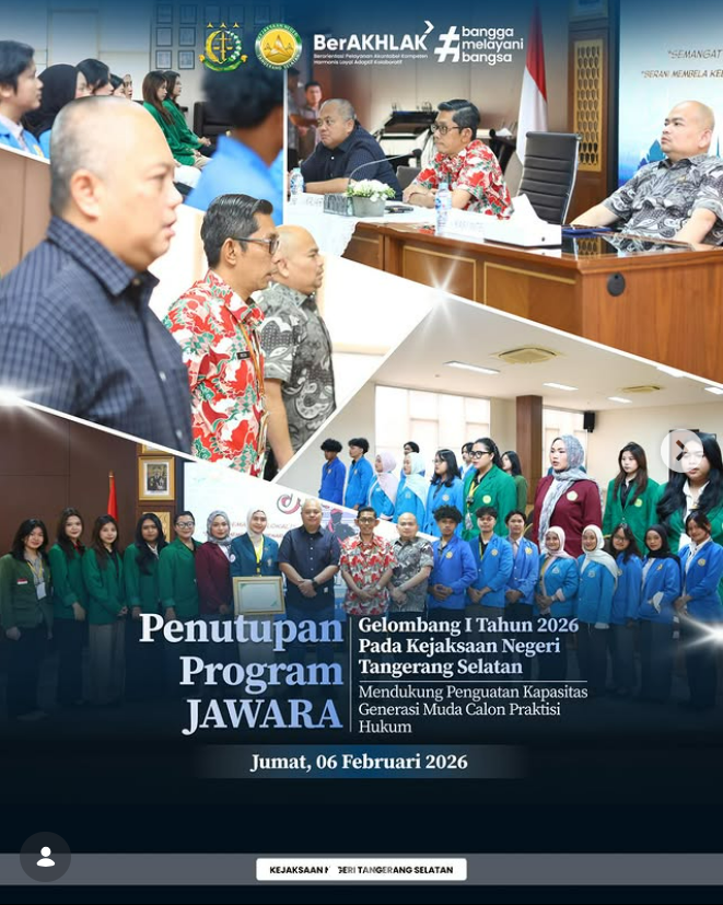 Program JAWARA (Jalinan Mahasiswa Magang Adhyaksa) Gelombang I Tahun 2026 Kejaksaan Negeri Tangerang Selatan resmi ditutup. Penutupan kegiatan tersebut dilakukan oleh Kepala Kejaksaan Negeri Tangerang Selatan, Apreza Darul Putra, S.H., M.H., sebagai penanda berakhirnya rangkaian pembinaan dan pelaksanaan magang mahasiswa di lingkungan Kejaksaan Negeri Tangerang Selatan. Selama mengikuti Program JAWARA Gelombang I Tahun 2026, para […]
