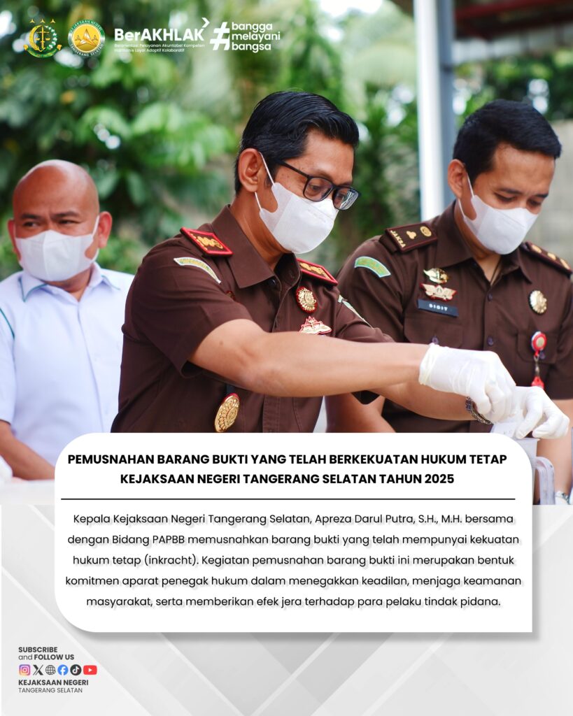 Kepala Kejaksaan Negeri Tangerang Selatan, Apreza Darul Putra, S.H., M.H. bersama dengan Bidang PAPBB memusnahkan barang bukti yang telah mempunyai kekuatan hukum tetap (inkracht). Barang bukti yang dimusnahkan merupakan hasil tindak pidana yang telah memperoleh putusan pengadilan, antara lain berupa:– Narkotika jenis Sabu dengan bruto 35,2075 gram– Narkotika jenis Sinte dengan broto 70,9198 gram– Obat-obatan […]