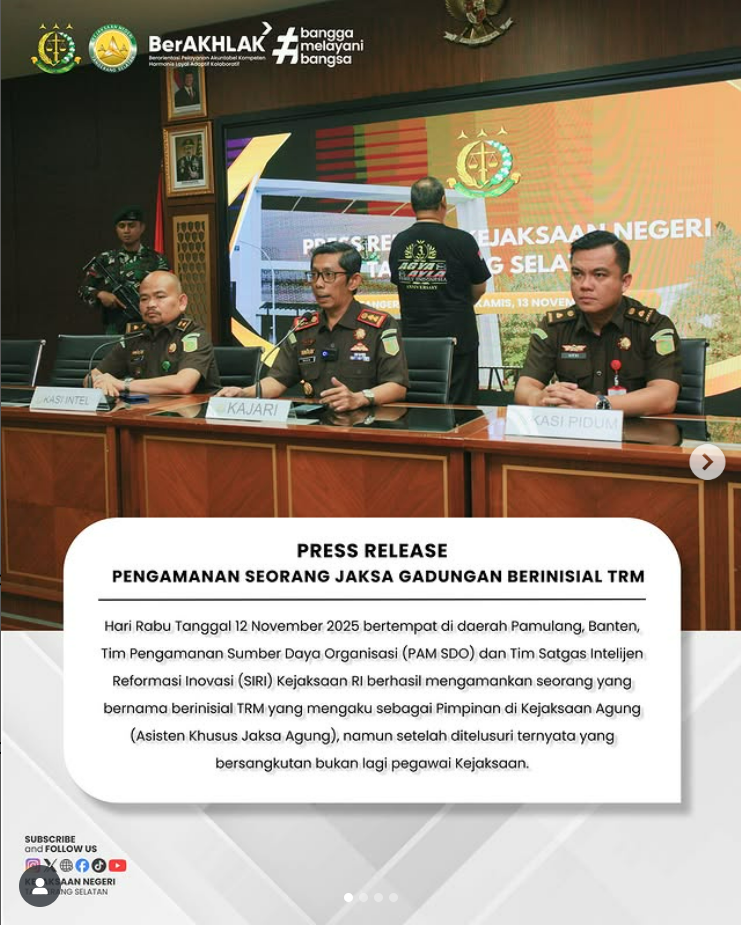Hari Rabu Tanggal 12 November 2025 bertempat di daerah Pamulang, Banten, Tim Pengamanan Sumber Daya Organisasi (PAM SDO) dan Tim Satgas Intelijen Reformasi Inovasi (SIRI) Kejaksaan RI berhasil mengamankan seorang yang bernama berinisial TRM yang mengaku sebagai Pimpinan di Kejaksaan Agung (Asisten Khusus Jaksa Agung), namun setelah ditelusuri ternyata yang bersangkutan bukan lagi pegawai Kejaksaan. […]