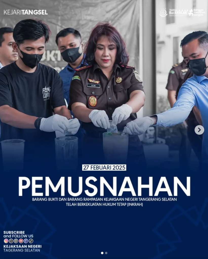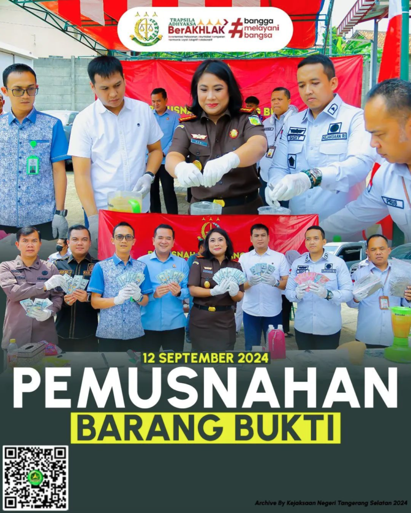 Tangerang Selatan Apsari Dewi, S.H., LL, M., Ph.D. didampingi oleh Kepala Seksi Pemulihan aset dan Pengelolaan Barang Bukti Suharyanto, S.E., S.H., M.H., Kepala Seksi Tindak Pidana Umum Hifni, S.H., M.H., Kepala Seksi Tindak Pidana Khusus Fajar Gigih Wibowo, S.H., M.H., Kepala Sub Bagian Pembinaan Iskandar Zulkarnain, S.H., M.H., memusnahkan barang bukti (BB) yang telah memiliki […]