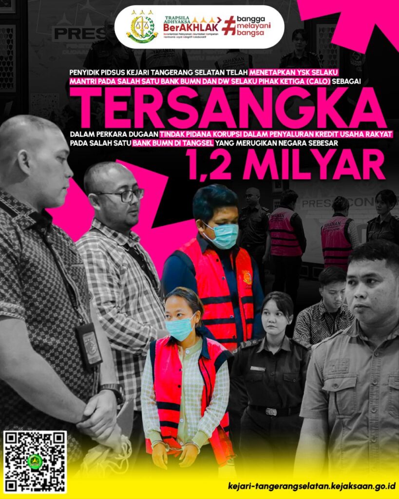 Jumat, tanggal 19 Agustus 2024, Tim Penyidik Pidsus Kejaksaan Negeri Tangerang Selatan telah menetapkan dua orang tersangka dengan inisial YSK selaku mantri dan DW selaku calo dalam perkara Dugaan Tindak Pidana Korupsi Penyaluran Kredit Usaha Rakyat pada salah satu Bank BUMN di Tangerang Selatan yang diduga merugikan Negara sebesar 1,2 milyar rupiah. Bahwa modus yang […]