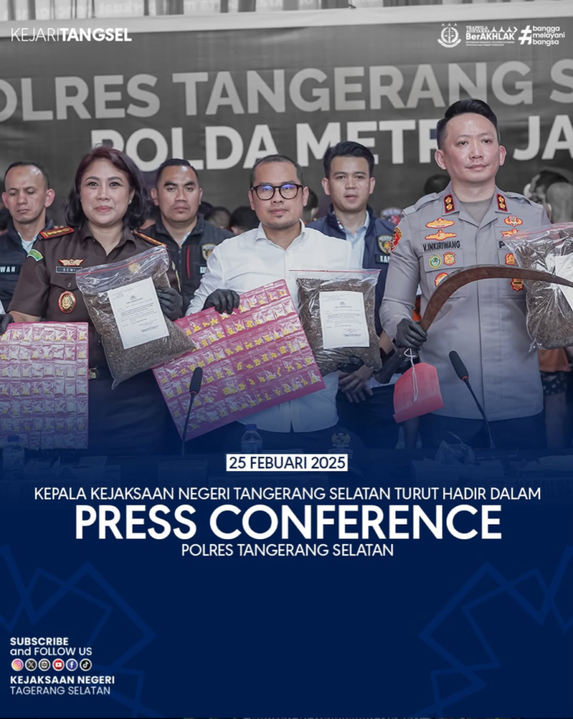 Kepala Kejaksaan Negeri Tangerang Selatan Apsari Dewi, S.H., LL., M., Ph.D bersama dengan Kepala Seksi Tindak Pidana Umum Hifni, S.H., M.H. Menghadiri konferensi pers yang digelar Selasa (25/2/2025), Oleh Polres Tangerang Selatan Kepala Kejaksaan Negeri Tangerang Selatan menegaskan mendukung dan terus berkomitmen dalam memberantas kejahatan dengan berkolaborasi bersama Forkopimda,Kepolisian, dan TNI.