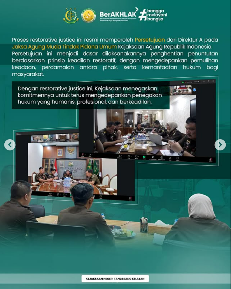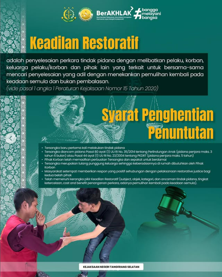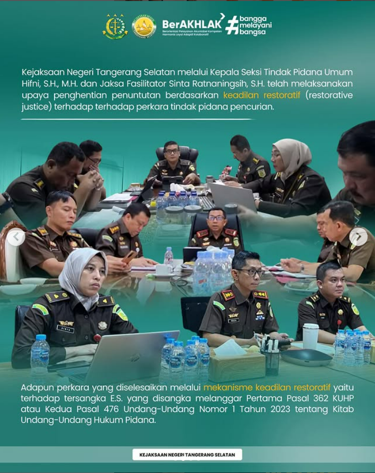 Kejaksaan Negeri Tangerang Selatan melalui Kepala Seksi Tindak Pidana Umum Hifni, S.H., M.H. dan Jaksa Fasilitator Sinta Ratnaningsih, S.H. telah melaksanakan upaya penghentian penuntutan berdasarkan keadilan restoratif (restorative justice) terhadap terhadap perkara tindak pidana pencurian.
