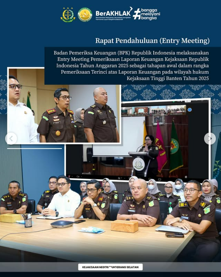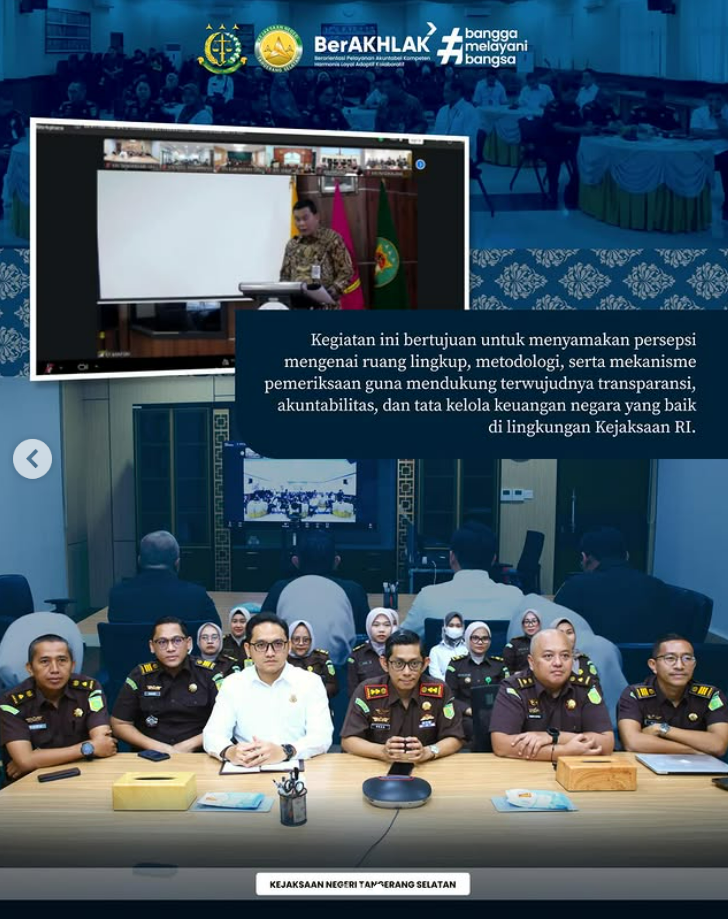 Kepala Kejaksaan Negeri Tangerang Selatan, Apreza Darul Putra, S.H., M.H., Para Kasi dan Kasubagbin beserta jajaran bidang keuangan mengikuti kegiatan video conference Entry Meeting yang diselenggarakan oleh Badan Pemeriksa Keuangan (BPK) Republik Indonesia dengan Kejaksaan Tinggi Banten dalam rangka Pemeriksaan Terinci atas Laporan Keuangan pada wilayah hukum Kejaksaan Tinggi dan Kejaksaan Negeri se-Wilayah Banten Tahun Anggaran 2025.
