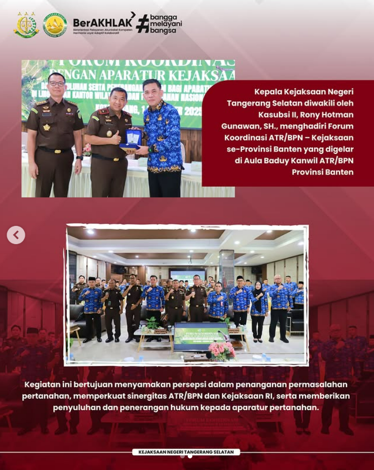 Kepala Kejaksaan Negeri Tangerang Selatan diwakili oleh Kasubsi II, Rony Hotman Gunawan, SH., menghadiri Forum Koordinasi ATR/BPN – Kejaksaan se-Provinsi Banten yang digelar di Aula Baduy Kanwil ATR/BPN Provinsi Banten, Senin (01/12/2025).