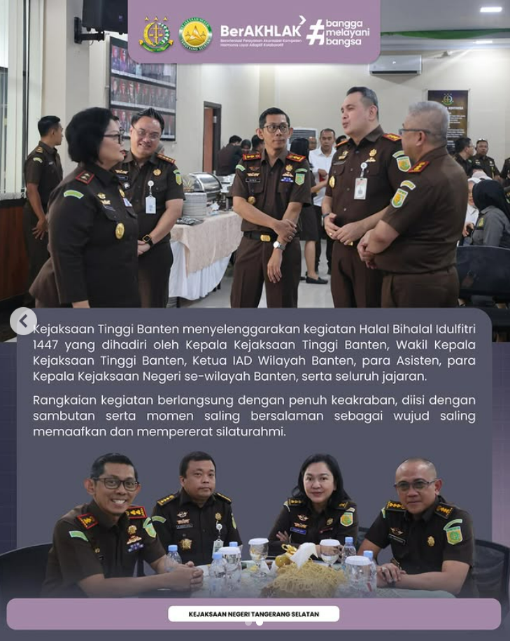 Kejaksaan Tinggi Banten menyelenggarakan kegiatan Halal Bihalal Idulfitri 1447 H yang berlangsung di Aula Kejati Banten dalam suasana penuh kehangatan, kebersamaan, dan kekeluargaan.
