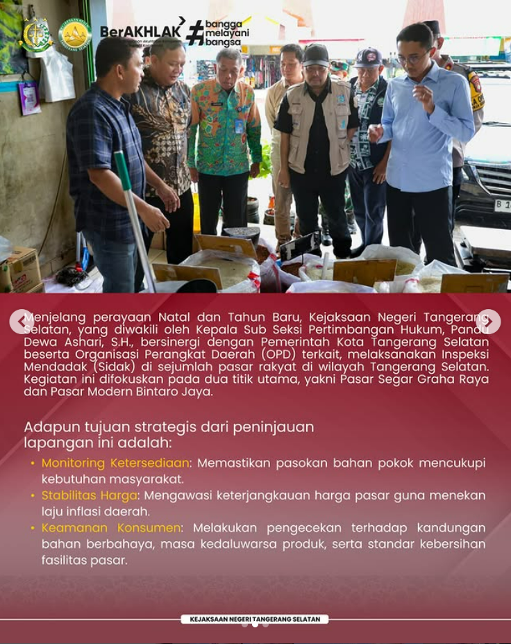 Menjelang perayaan Natal dan Tahun Baru, Kejaksaan Negeri Tangerang Selatan, yang diwakili oleh Kepala Sub Seksi Pertimbangan Hukum, Pandu Dewa Ashari, S.H., bersinergi dengan Pemerintah Kota Tangerang Selatan beserta Organisasi Perangkat Daerah (OPD) terkait, melaksanakan Inspeksi Mendadak (Sidak) di sejumlah pasar rakyat di wilayah Tangerang Selatan.