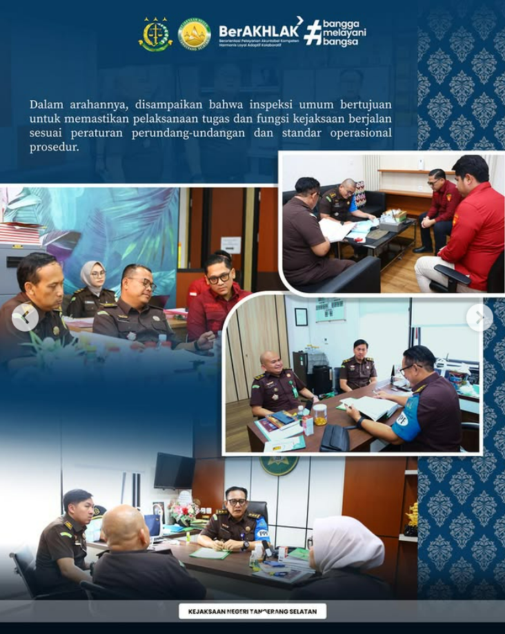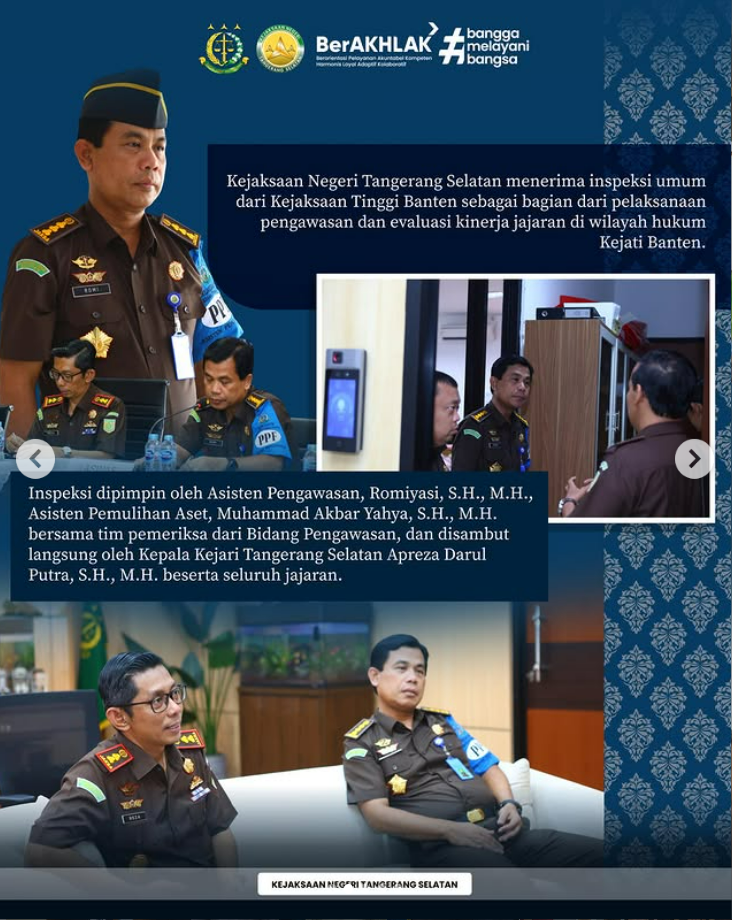Kejaksaan Negeri Tangerang Selatan menerima inspeksi umum dari Kejaksaan Tinggi Banten sebagai bagian dari pelaksanaan pengawasan dan evaluasi kinerja jajaran di wilayah hukum Kejati Banten.