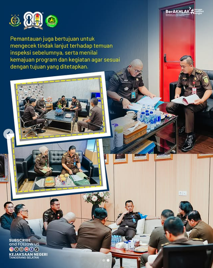 Pada hari Senin (15/09/2025), Plh. Kepala Kejaksaan Negeri Tangerang Selatan, Sigit Suharyanto, S.E., S.H., M.H., menerima kunjungan Asisten Pengawasan (Aswas), Yuyun Wahyudi, S.H., M.H. dan tim Pemeriksa Kejaksaan Tinggi Banten, kehadiran Aswas ini difokuskan pada evaluasi kinerja dan pemantauan hasil inspeksi.