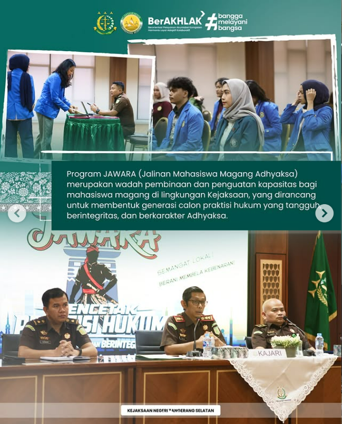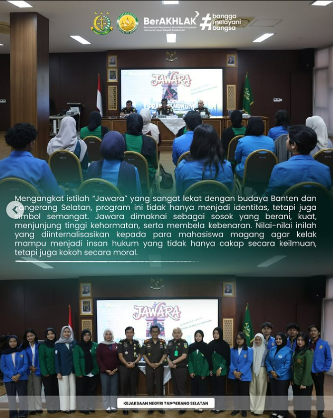 Kepala Kejaksaan Negeri Tangerang Selatan, Apreza Darul Putra, S.H., M.H. Beserta Kepala Sub Bagian Pembinaan Iskandar Zulkarnain, S.H., M.H..dan Kepala Seksi Intelijen Ronny Bona Tua Hutagalung, S.H., M.H. Dengan resmi membuka Program JAWARA (Jalinan Mahasiswa Magang Adhyaksa) yang merupakan wadah pembinaan dan penguatan kapasitas bagi mahasiswa magang di lingkungan Kejaksaan, yang dirancang untuk membentuk generasi calon praktisi hukum yang tangguh, berintegritas, dan berkarakter Adhyaksa.