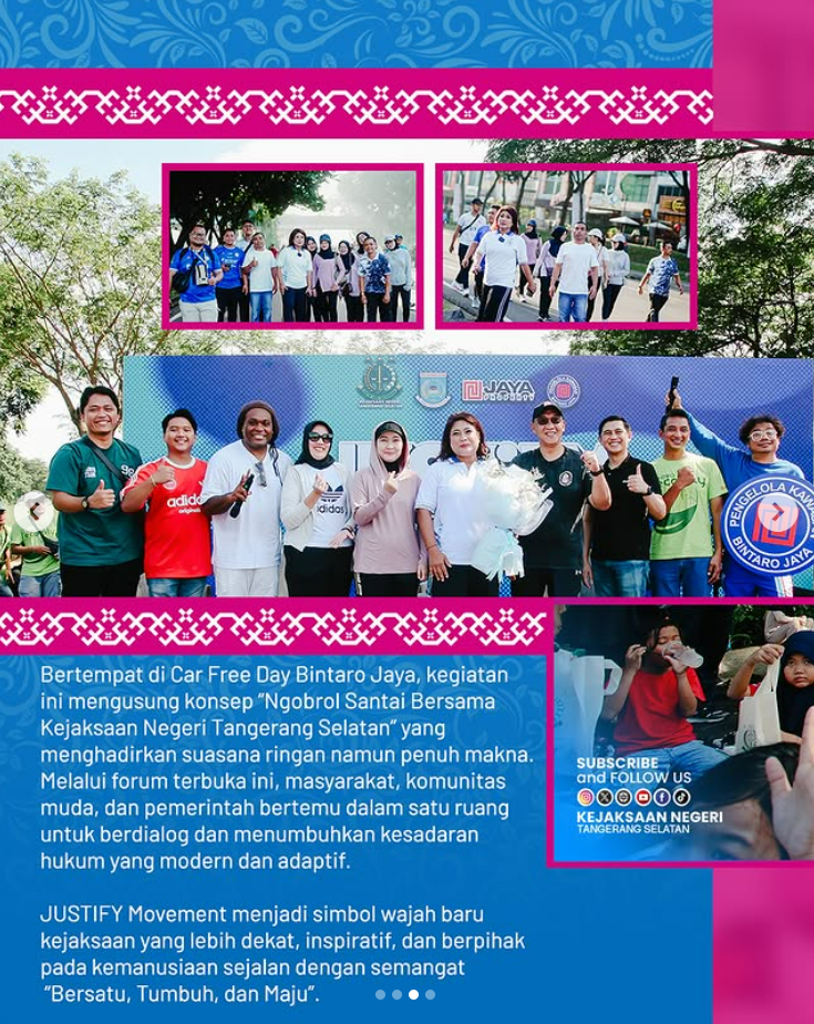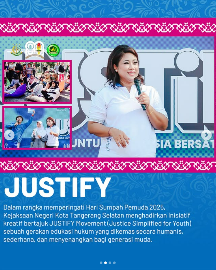 Dalam rangka memperingati Hari Sumpah Pemuda Tahun 2025, Kejaksaan Negeri Kota Tangerang Selatan menghadirkan sebuah inisiatif kreatif bertajuk JUSTIFY Movement (Justice Simplified for Youth) pada kegiatan Car Free Day Bintaro Jaya dengan mengusung konsep “Ngobrol Santai Bersama Kejaksaan Negeri Tangerang Selatan”, yang diselenggarakan pada hari Minggu tanggal 26 Oktober 2025.