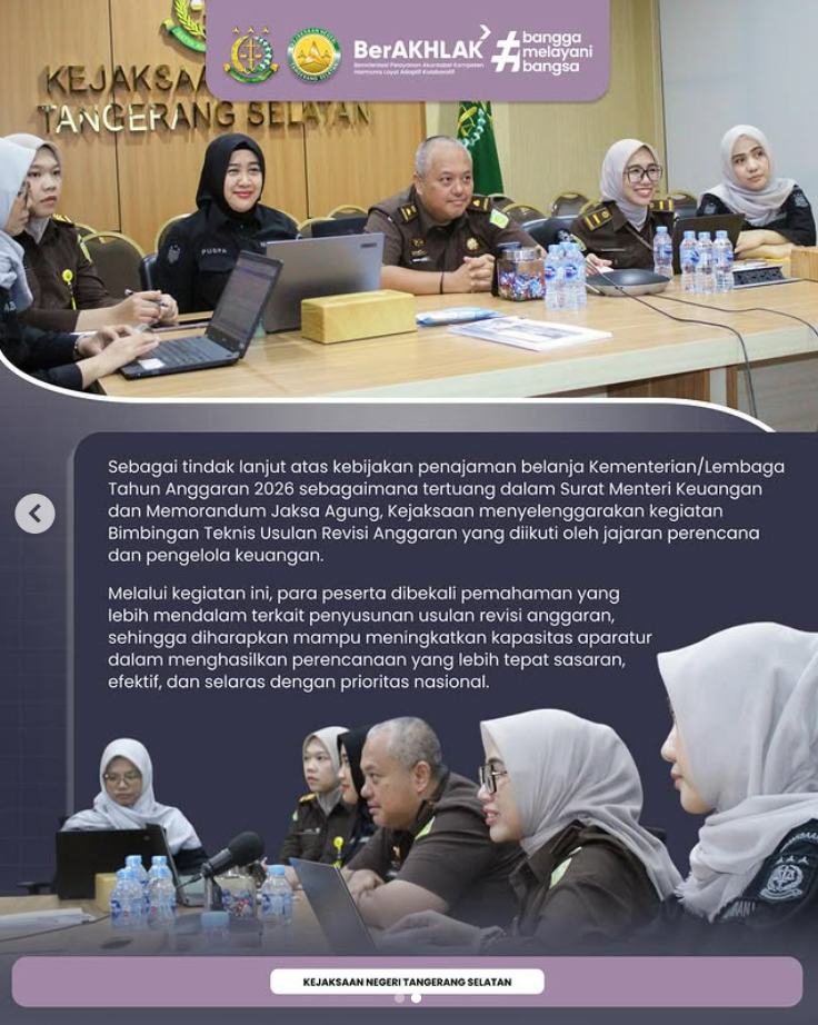 Sebagai tindak lanjut atas kebijakan penajaman belanja Kementerian/Lembaga Tahun Anggaran 2026 sebagaimana tertuang dalam Surat Menteri Keuangan dan Memorandum Jaksa Agung, Kejaksaan menyelenggarakan kegiatan Bimbingan Teknis Usulan Revisi Anggaran yang diikuti oleh jajaran perencana dan pengelola keuangan.