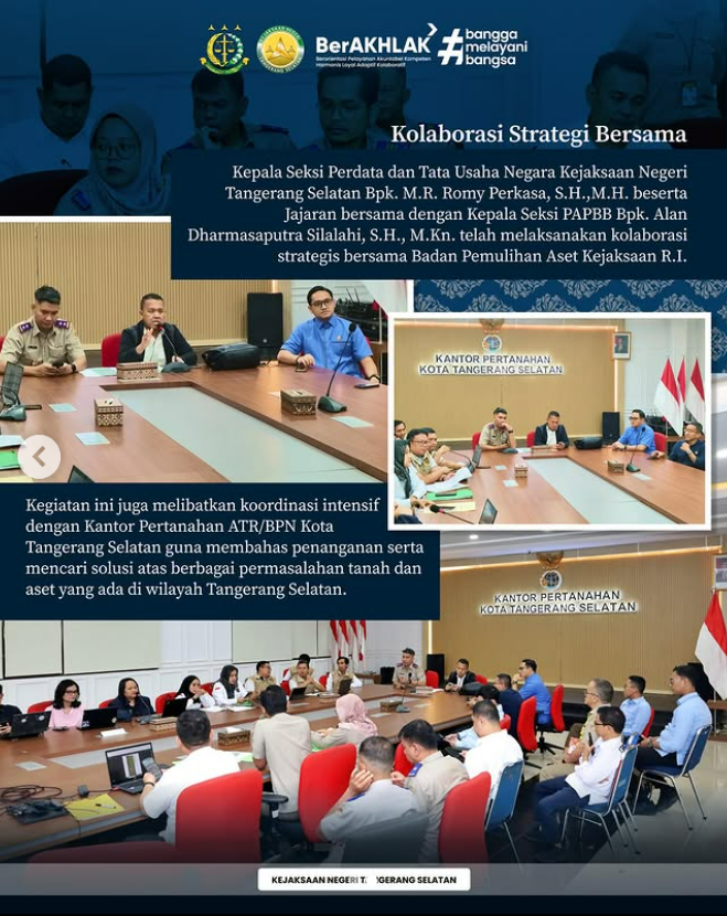 Kepala Seksi Perdata dan Tata Usaha Negara Kejaksaan Negeri Tangerang Selatan Bpk. M.R. Romy Perkasa, S.H.,M.H. beserta Jajaran bersama dengan Kepala Seksi PAPBB Bpk. Alan Dharmasaputra Silalahi, S.H., M.Kn. telah melaksanakan kolaborasi strategis bersama Badan Pemulihan Aset Kejaksaan R.I.