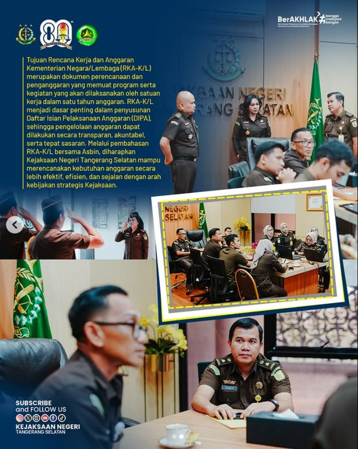 Tujuan Rencana Kerja dan Anggaran Kementerian Negara/Lembaga (RKA-K/L) merupakan dokumen perencanaan dan penganggaran yang memuat program serta kegiatan yang akan dilaksanakan oleh satuan kerja dalam satu tahun anggaran. RKA-K/L menjadi dasar penting dalam penyusunan Daftar Isian Pelaksanaan Anggaran (DIPA), sehingga pengelolaan anggaran dapat dilakukan secara transparan, akuntabel, serta tepat sasaran. Melalui pembahasan RKA-K/L bersama Asbin, diharapkan Kejaksaan Negeri Tangerang Selatan mampu merencanakan kebutuhan anggaran secara lebih efektif, efisien, dan sejalan dengan arah kebijakan strategis Kejaksaan.