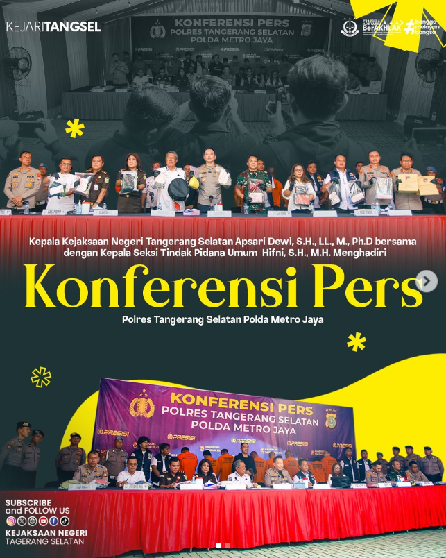 Kepala Kejaksaan Negeri Tangerang Selatan Apsari Dewi, S.H., LL.M., Ph.D hadir dalam konferensi pers yang diadakan oleh Kepolisian Resor Tangerang Selatan pada Rabu (02/07/2025). Dalam