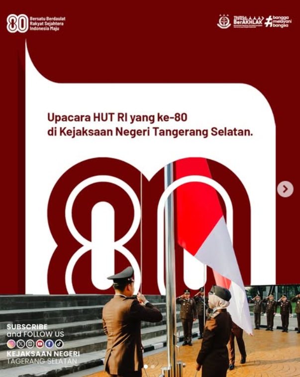 Kepala Kejaksaan Negeri Tangerang Selatan, Ibu Apsari Dewi, S.H., LL., M., PH., D., bersama Forkopimda Kota Tangerang Selatan melaksanakan Upacara Pengibaran Bendera Merah Putih di