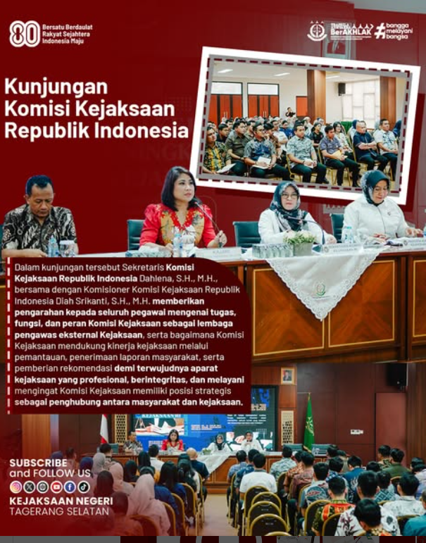 Kepala Kejaksaan Negeri Tangerang Selatan, Apsari Dewi, S.H., LL.M., Ph.D. menerima kunjungan kerja dari Komisi Kejaksaan Republik Indonesia pada Jumat (15/08/2025). Perlu Sobat Adhyaksa ketahui,