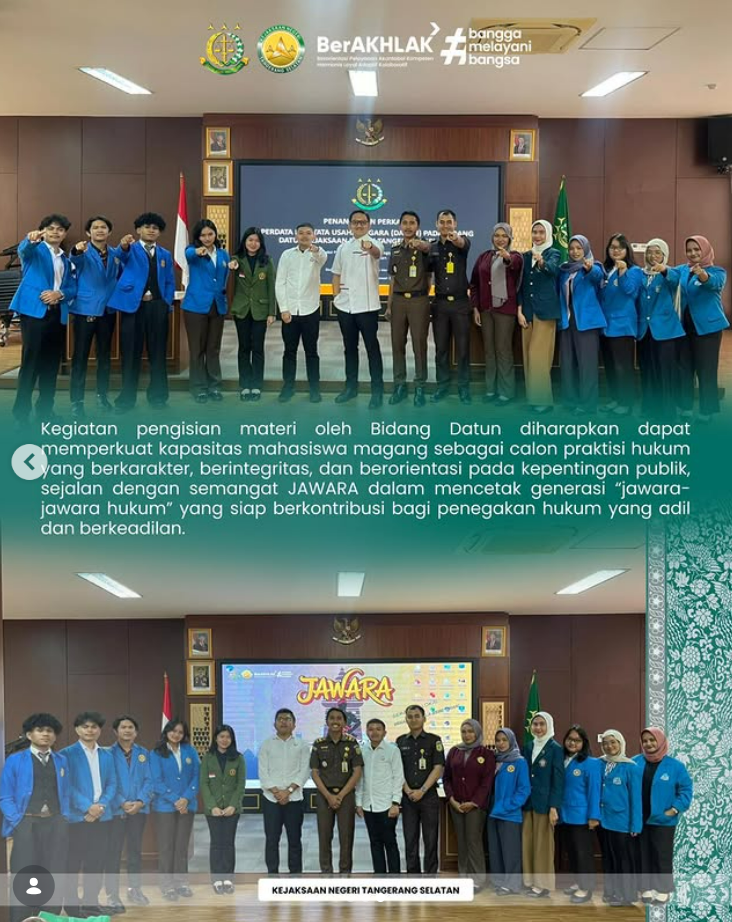 Kegiatan pengisian materi oleh Bidang Datun diharapkan dapat memperkuat kapasitas mahasiswa magang sebagai calon praktisi hukum yang berkarakter, berintegritas, dan berorientasi pada kepentingan publik, sejalan dengan semangat JAWARA dalam mencetak generasi “jawara-jawara hukum” yang siap berkontribusi bagi penegakan hukum yang adil dan berkeadilan.