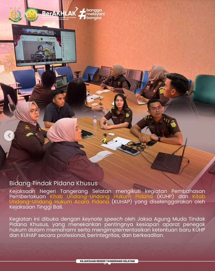 Bidang Tindak Pidana Khusus Kejaksaan Negeri Tangerang Selatan mengikuti kegiatan Pembahasan Pemberlakuan Kitab Undang-Undang Hukum Pidana (KUHP) dan Kitab Undang-Undang Hukum Acara Pidana (KUHAP) yang diselenggarakan oleh Kejaksaan Tinggi Bali.
