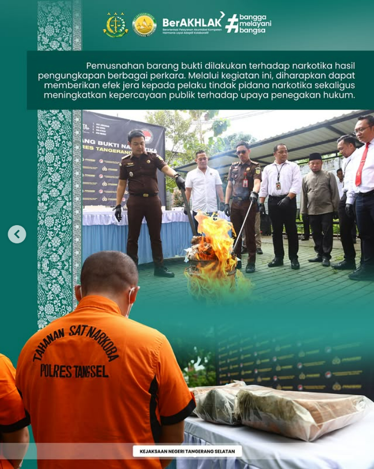 Kepala Sub Seksi Pra Penuntutan Rezky, SH., MH. bersama dengan Kepala Sub Seksi Penuntutan pada seksi Tindak Pidana Umum Eric Putradiyanto, S.H., M.H. Menghadiri kegiatan pemusnahan barang bukti narkotika sebagai bagian dari proses penegakan hukum terhadap tindak pidana narkotika yang diselenggarakan oleh Satresnarkoba Polres Tangerang Selatan.