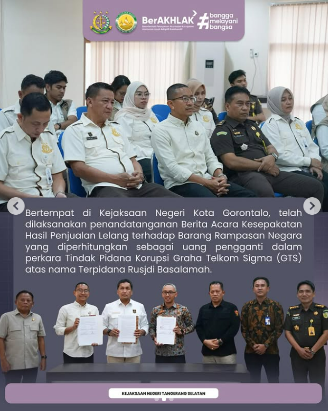 Bertempat di Kejaksaan Negeri Kota Gorontalo, telah dilaksanakan penandatanganan Berita Acara Kesepakatan Hasil Penjualan Lelang terhadap Barang Rampasan Negara yang diperhitungkan sebagai Uang Pengganti dalam perkara Tindak Pidana Korupsi Graha Telkom Sigma (GTS) atas nama Terpidana Rusjdi Basalamah.