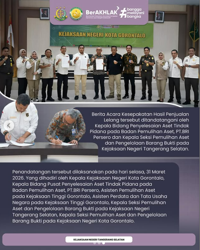 Penandatangan tersebut dilaksanakan pada hari Selasa, 31 Maret 2026. Yang dihadiri oleh Kepala Kejaksaan Negeri Kota Gorontalo, Kepala Bidang Pusat Penyelesaian Aset Tindak Pidana pada Badan Pemulihan Aset, PT.BRI Persero, Asisten Pemulihan Aset pada Kejaksaan Tinggi Gorontalo, Asisten Perdata dan Tata Usaha Negara pada Kejaksaan Tinggi Gorontalo, Kepala Seksi Pemulihan Aset dan Pengelolaan Barang Bukti pada Kejaksaan Negeri Tangerang Selatan, Kepala Seksi Pemulihan Aset dan Pengelolaan Barang Bukti pada Kejaksaan Negeri Kota Gorontalo