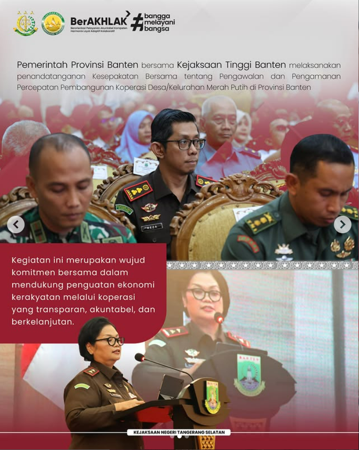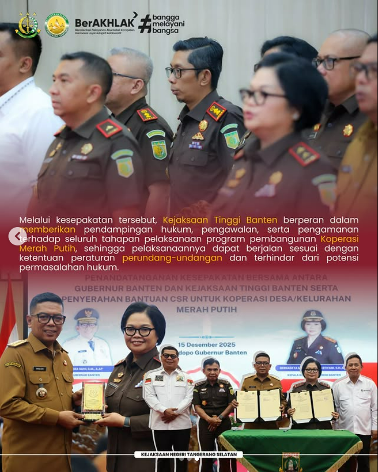 Melalui kesepakatan tersebut, Kejaksaan Tinggi Banten berperan dalam memberikan pendampingan hukum, pengawalan, serta pengamanan terhadap seluruh tahapan pelaksanaan program pembangunan Koperasi Merah Putih, sehingga pelaksanaannya dapat berjalan sesuai dengan ketentuan peraturan perundang-undangan dan terhindar dari potensi
