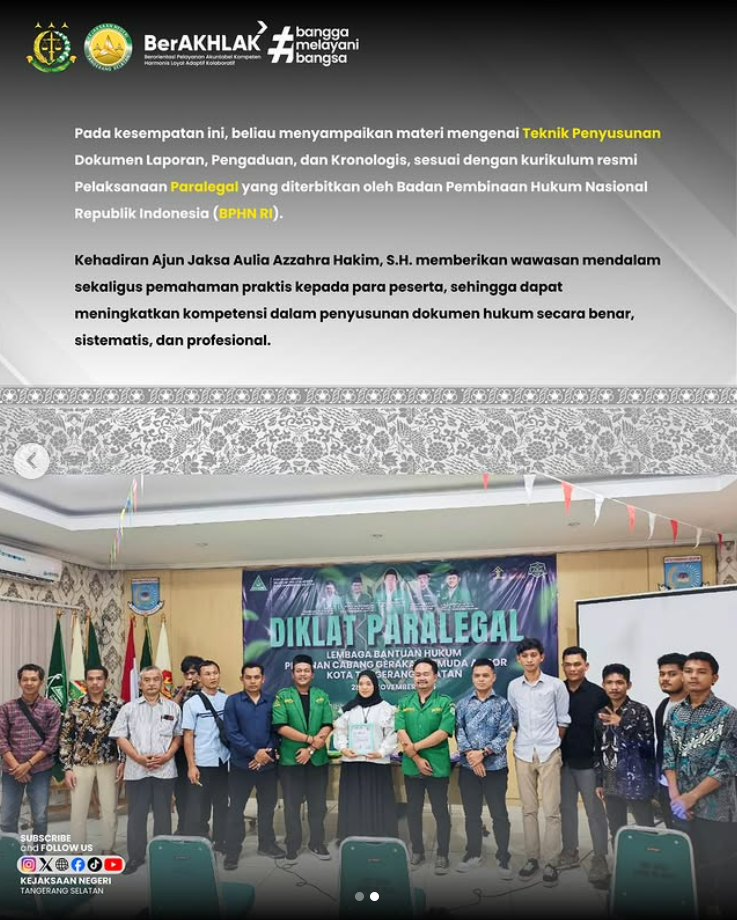 Kepala Kejaksaan Negeri Tangerang Selatan, yang diwakili oleh Ajun Jaksa Aulia Azzahra Hakim, S.H., hadir sebagai Narasumber dalam kegiatan Pendidikan dan Pelatihan Paralegal Lembaga Bantuan Hukum GP Ansor Angkatan I Tahun 2025 yang diselenggarakan oleh Pimpinan Cabang Gerakan Pemuda Ansor Kota Tangerang Selatan.
