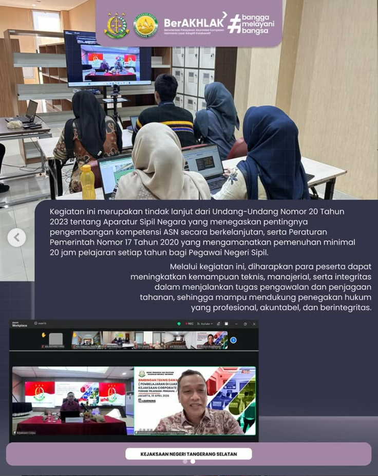 Dalam rangka meningkatkan kompetensi dan profesionalisme aparatur, Kejaksaan Republik Indonesia melalui Kejaksaan Corporate University menyelenggarakan kegiatan Bimbingan Teknis dan Manajemen (Pembelajaran di Luar Kampus) Tahun 2026 bagi Formasi Pelaksana Pengawal/Penjaga Tahanan.