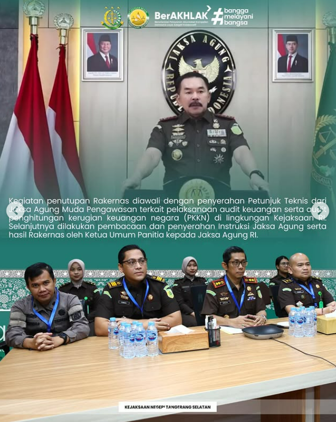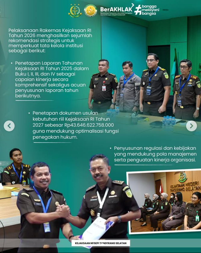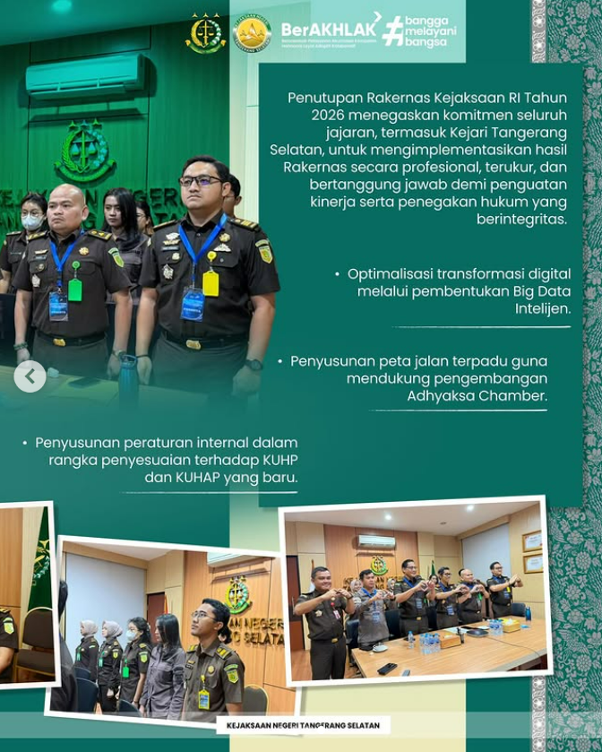 Penutupan Rakernas Kejaksaan RI Tahun 2026 menegaskan komitmen seluruh jajaran, termasuk Kejari Tangerang Selatan, untuk mengimplementasikan hasil Rakernas secara profesional, terukur, dan bertanggung jawab demi penguatan kinerja serta penegakan hukum yang berintegritas.